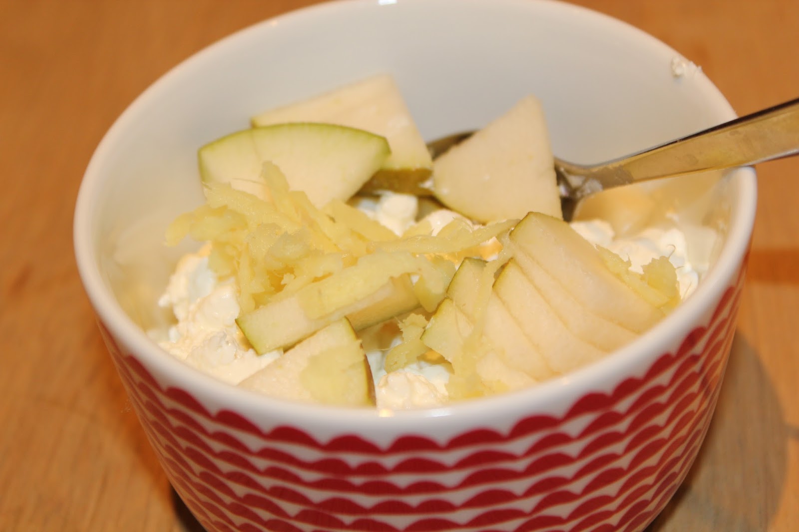1 dl cottage cheese. Skjær ca 1/4 del av en pære i tynne skiver (behøver ikke skrelles) og riv 1 cm frisk ingefær og ha over.